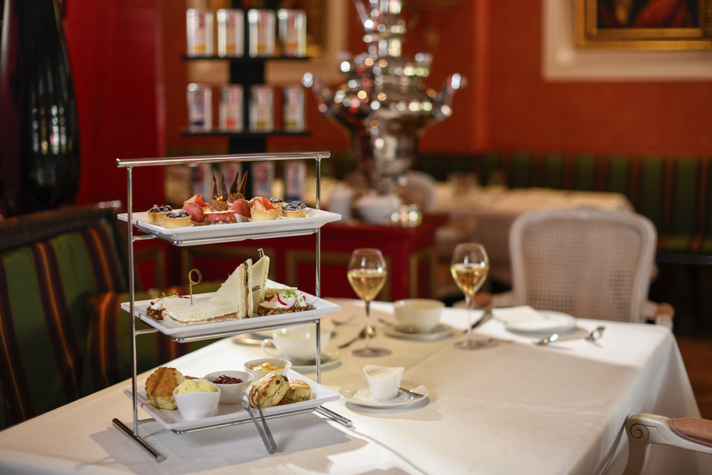 Freuen Sie sich auf klassische Köstlichkeiten wie Scones mit Clotted Cream, Sandwiches und kleine Kuchen, originalgetreu serviert auf einer Etagere. Wählen Sie aus einer Vielzahl an Qualitäts-Tees des Teehauses Ronnefeldt am Samowar.